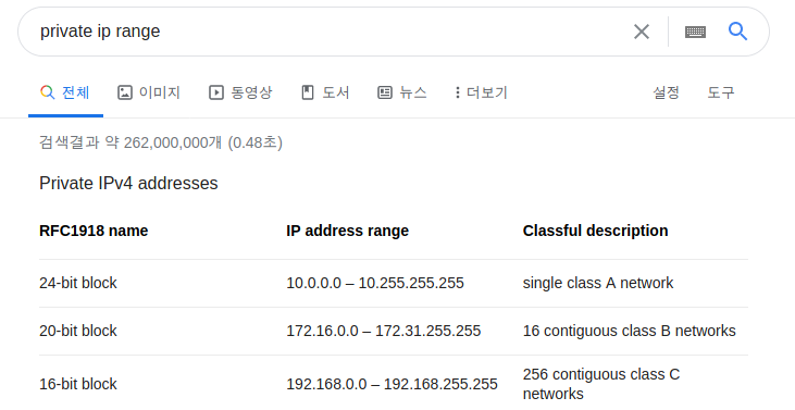 위와 같은 범위를 원하는데로 설정하여 사설 네트워크로 구성이 가능하다.