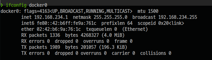 그리고 ifconfig docker0 명령어를 이용하여 ip 설정을 확인하면 맨 위의 이미지와 같은 변경된 IP 대역의 docker0 정보를 확인할 수 있다.
