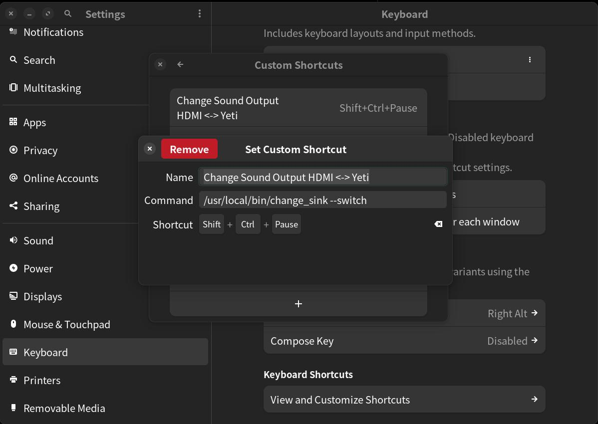 저의 리눅스 DE 는 gnome 이기때문에 settings -> keyboard -> keyboard shrotcuts -> custom shortcuts 에서 단축키를 추가했습니다.