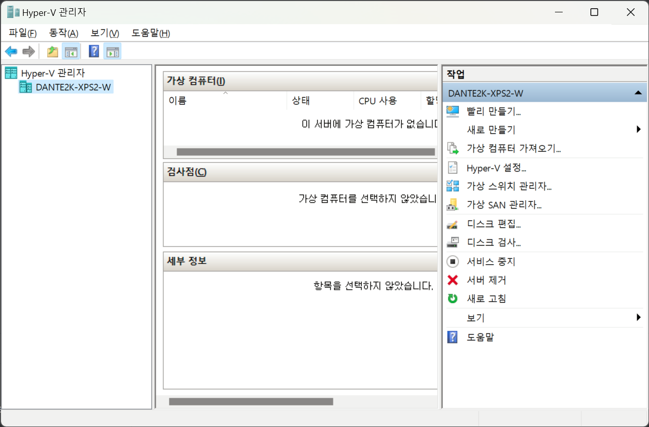 윈도우 시작 버튼을 클릭하고 `Hyper-V 관리자` 를 검색해 실행합니다. 아래와 같은 관리자 창이 뜰겁니다.