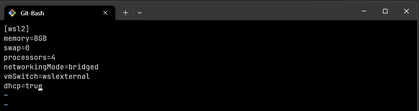네트워크 설정과 관련된 것은 아래 3줄입니다. wmSwitch 에 보이는 `wslexternal` 이 Hyper-V 관리자에서 가상 스위치에 추가했던 가상 네트워크 이름입니다. 틀리지 않게 잘 적어줍니다.