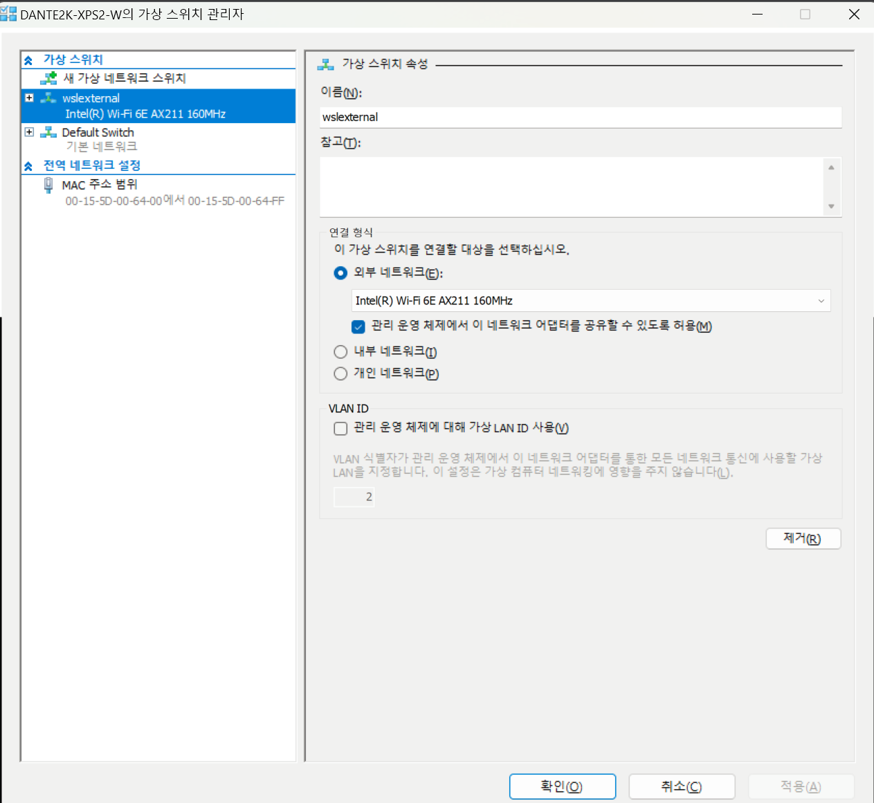 외부 네트워크 장치는 인터넷에 연결되어 있는 NIC, WIFI 장치를 선택하면 됩니다. 저의 경우 AX211 이라는 장치는 WIFI 장치입니다. `확인` 버튼을 누르고, 가상 스위치 관리자를 닫습니다.