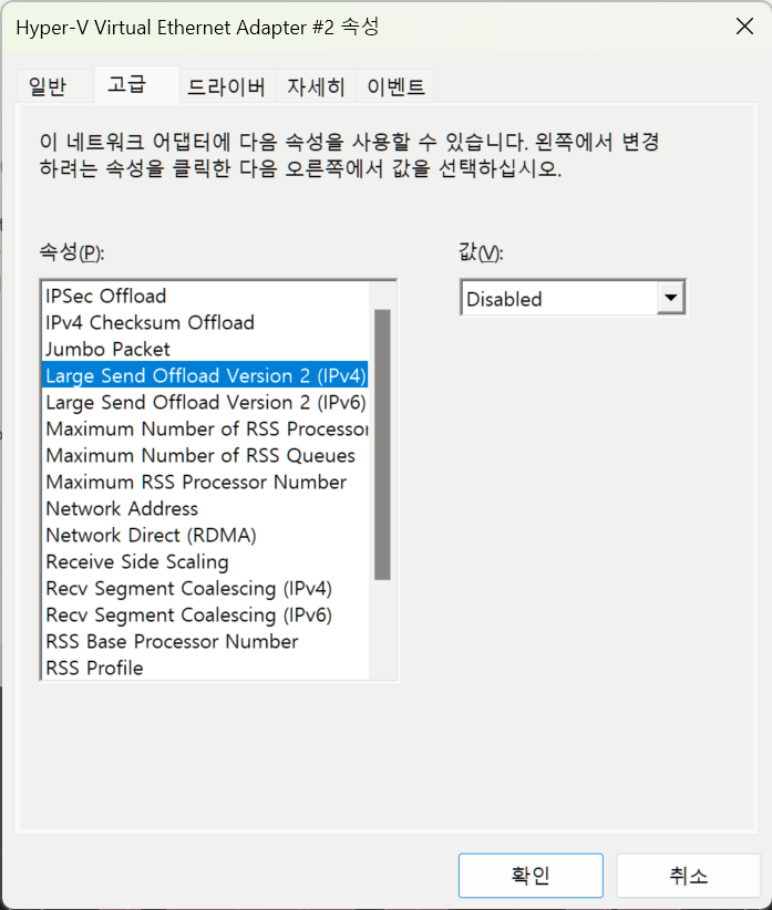장치 관리자 - 네트워크 어댑터 목록에서 Hyper-V Virtual Ethernet Adapter 라는 항목이 추가된 것을 확인할 수 있는데, 이장치의 속성 - 고급에서 'Large Send Offload Version 2 (IPV4)', 'Large Send Offload Version 2 (IPV6)' 두 항목의 값을 Disabled 로 변경해주면 업로드 속도가 해결된다.