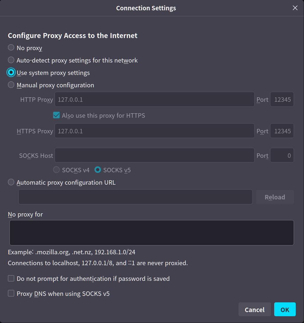 별도의 설정이 필요없이 use system proxy settings 을 선택하고 OK 를 눌러 저장합니다. 아래 보시면 아시겠지만, gnome network proxy 에 설정한 내용이 그대로 표시됩니다.