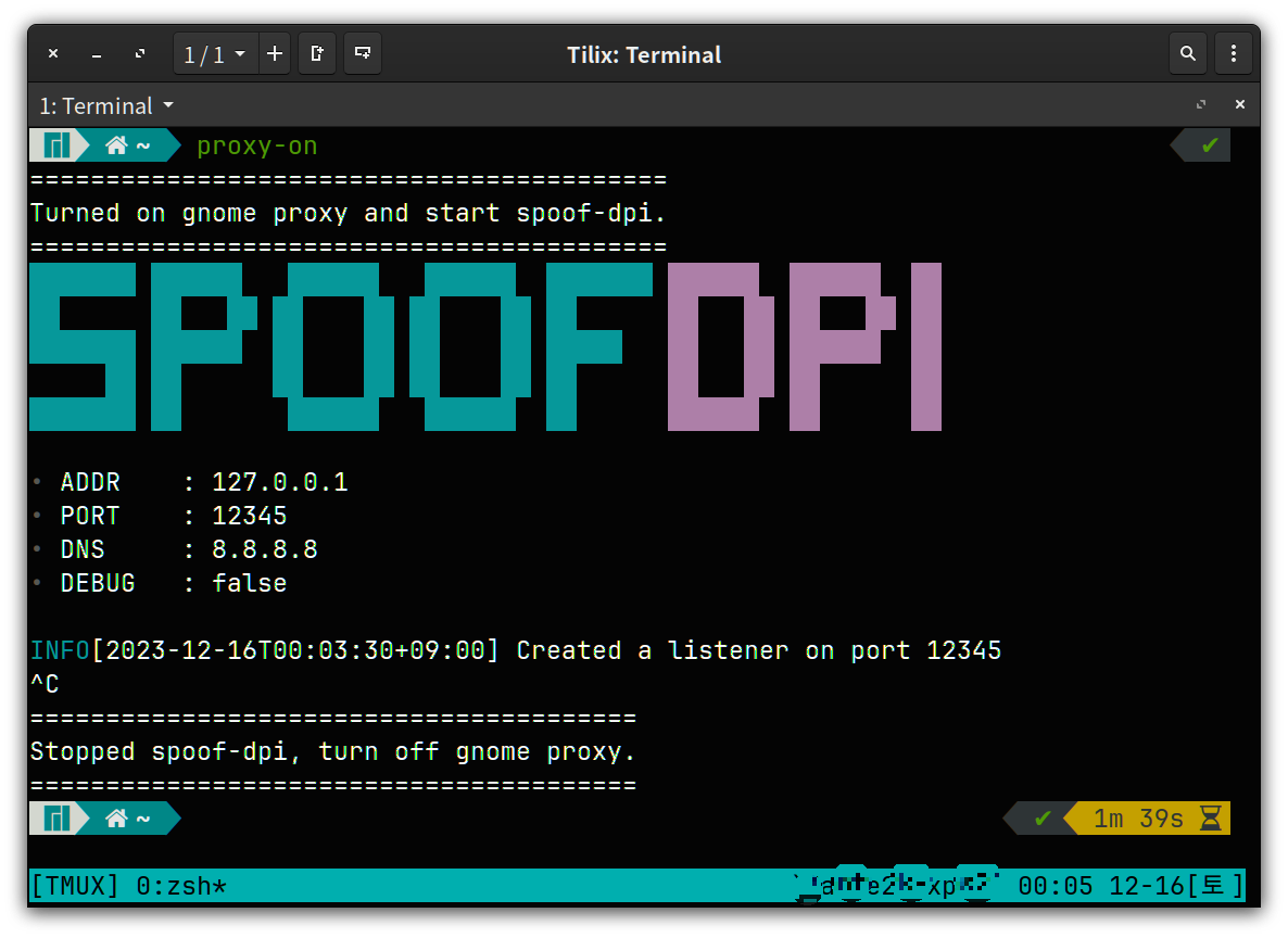 spoof-dpi 앱이 잘 실행되었고, gnome network proxy 가 잘 적용되었는지 확인합니다.