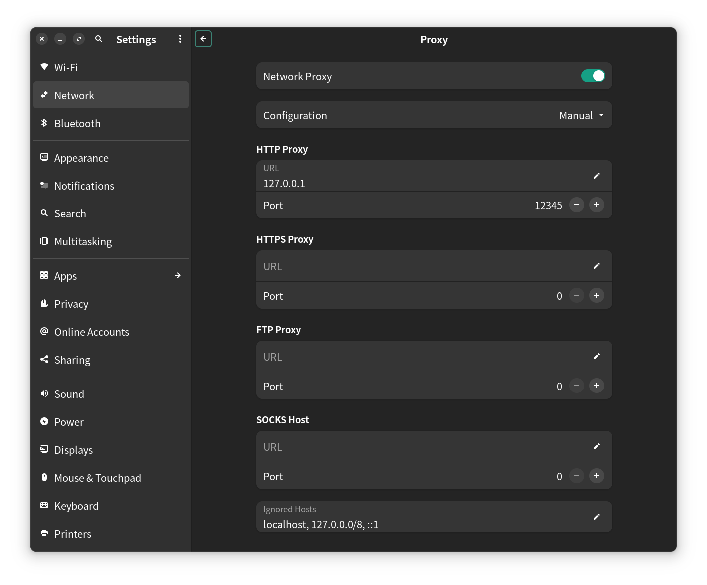spoof-dpi 앱이 잘 종료되고, 스크립트의 ctrl_c 함수도 잘 실행되었네요. gnome network proxy 를 살펴봅니다.