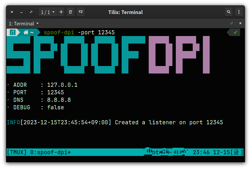 이제 spoof-dpi 명령어를 입력해서 실행해볼 수 있습니다. 저는 추가로 -port 옵션을 사용해서 포트를 수동 지정해보겠습니다. 기본 포트는 8080으로 동작합니다.