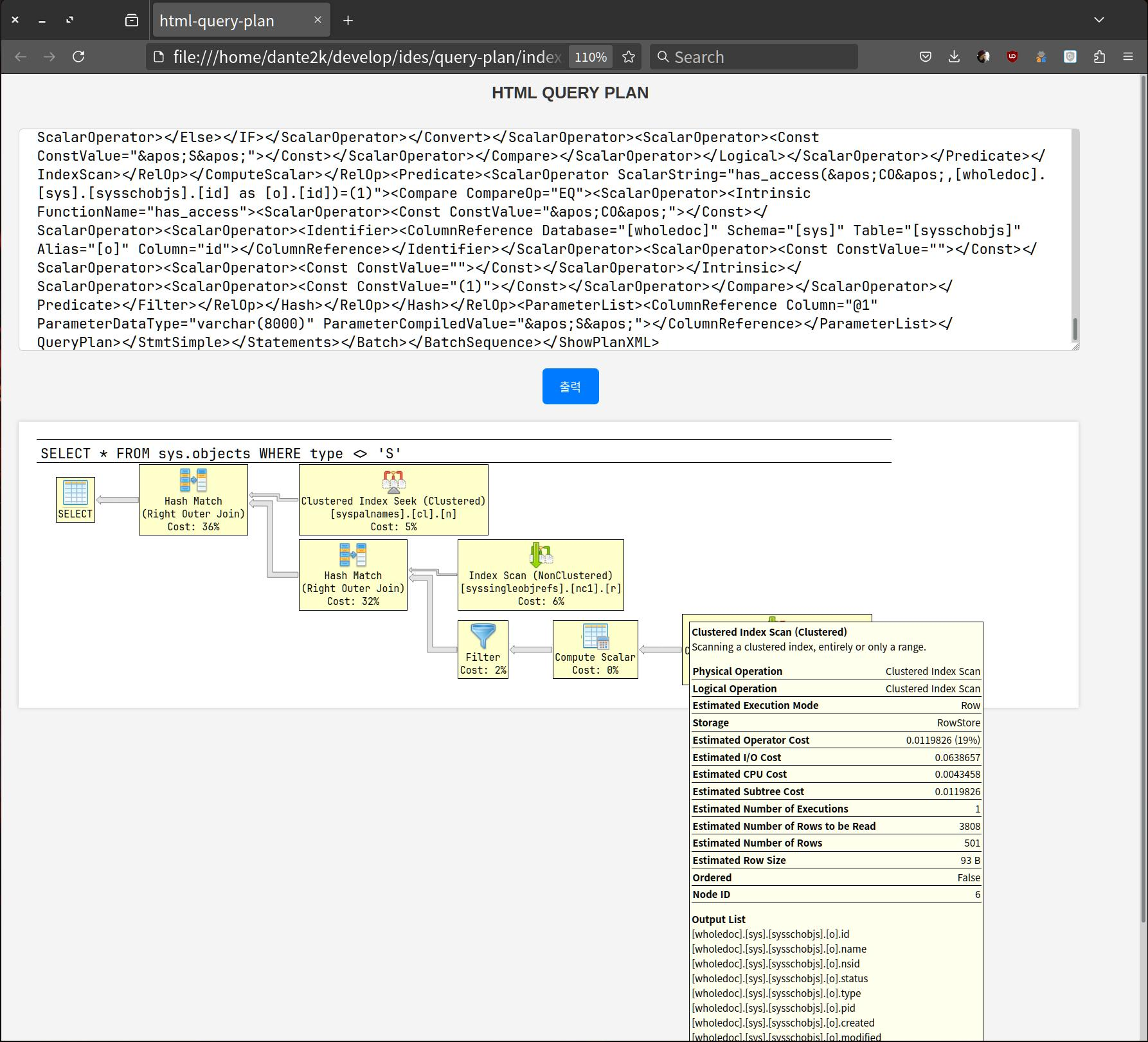 위와 같이, SSMS 에서 확인할 수 있는 실행 계획과 동일한 수준으로 실행 계획을 확인할 수 있습니다. 각 요소별 마우스 오버 시 추가적은 정보도 출력됩니다. 이렇게 SSMS 를 사용할 수 없는 환경에서도 SSMS 와 동등한 수준의 실행 계획을 파악할 수 있는 방법을 알아보았습니다.