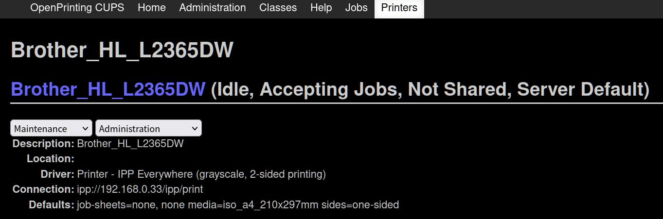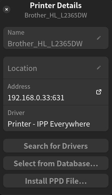 sudo lpadmin -p Brother_HL_L2365DW -v ipp://192.168.0.33/ipp/print -E -m everywhere
