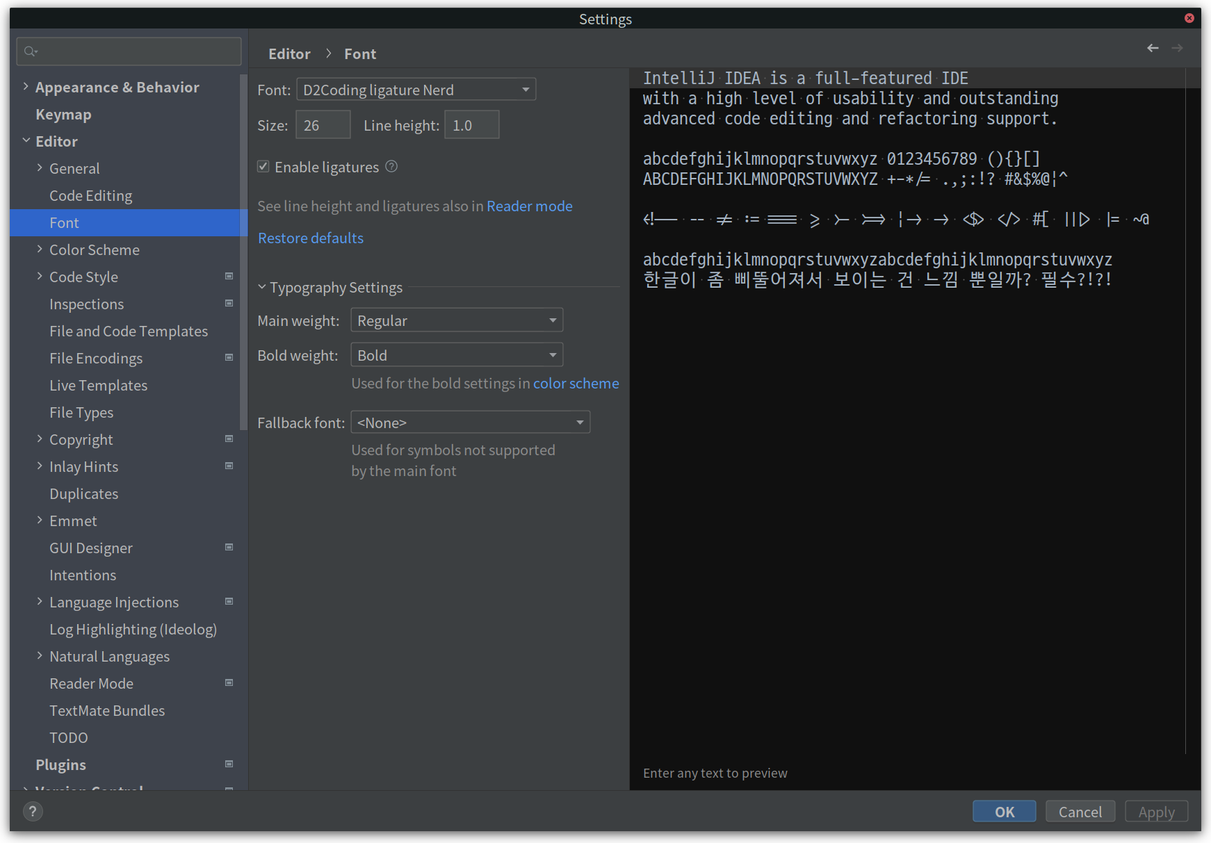 jetbrains intellij 에 edtior font 를 변경해보았는데, typography settings 하단에 main weight, bold weight 에 정상적?으로 regular, bold 를 설정할 수 있습니다. (font family 가 맞쳐지지 않은 경우, 둘 다 동일하게 설정할 수 밖에 없습니다.)