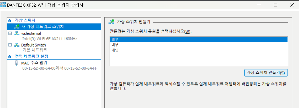 외부 네트워크 장치는 인터넷에 연결되어 있는 NIC, WIFI 장치를 선택하면 됩니다. 저의 경우 AX211 이라는 장치는 WIFI 장치입니다. `확인` 버튼을 누르고, 가상 스위치 관리자를 닫습니다.