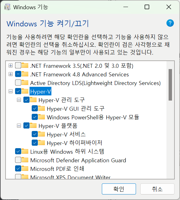 1. `Windows 기능 켜기/끄기` 에서 `Hyper-V` 활성화